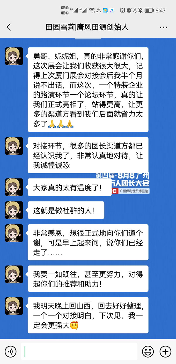 展會過后,雪莉反饋:真的非常感謝你們,這次展會讓我們收獲很大很大,這次一個(gè)特裝企業(yè)路演環(huán)節(jié)一個(gè)論壇環(huán)節(jié),真的讓我們正式亮相了,站得更高,讓更多的渠道方看到我們。后面省力太我太多了。對接環(huán)節(jié),很多的團(tuán)長渠道方已經(jīng)認(rèn)識我了,非常認(rèn)真地對待。
