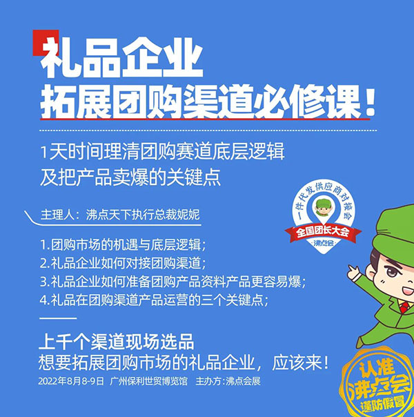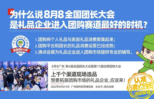 8月8廣州,第4屆全國團長大會暨第17屆社群團購大會,社群團購平臺及各工具平臺團長聚集,上千個渠道現場選品,想要拓展個人消費市場,進入團購市場的禮品企業,一定要來!