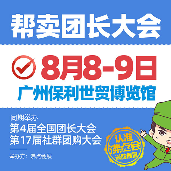 2022年8月8號,全國幫賣團長大會將在廣州保利世貿展覽館舉行,同期還將舉辦第4屆全國團長大會和第17屆社群團購大會,舉辦方是沸點會展。