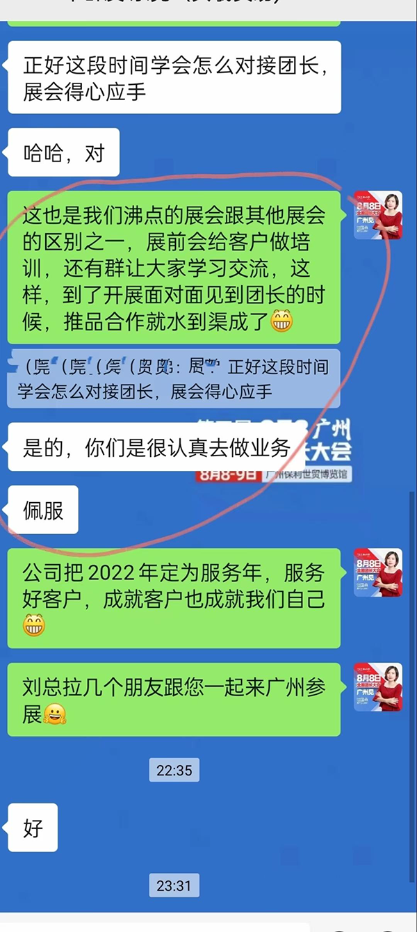 下面是一個企業在參加完沸點會展針對8月8廣州全國團長大會后,給沸點會展銷售總監江國燕的反饋: