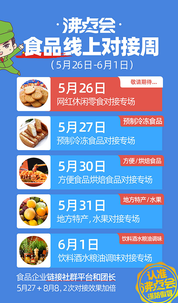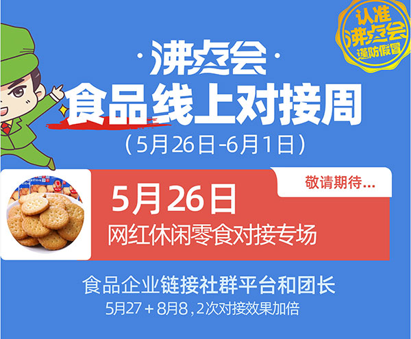為助力食品企業(yè)精準對接社群渠道資源,把握社群食品品類的銷售增長機遇,沸點會展特打造【沸點會.食品對接專場】,為食品產(chǎn)品企業(yè)提供一個與社群團購平臺及團長專場的對接機會,從而讓雙方快速精準對接,實現(xiàn)銷售增長,時間從5月26日-6月1日。