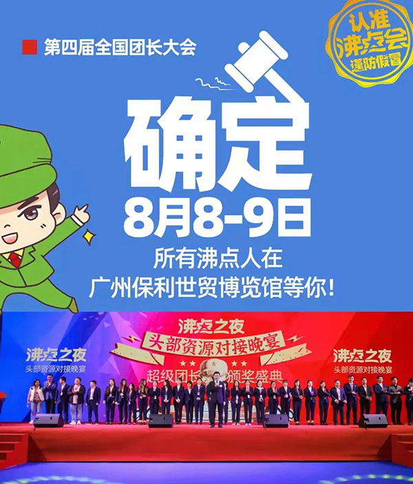 2021年9月18號(hào),首全s國(guó)團(tuán)長(zhǎng)大會(huì)由沸點(diǎn)會(huì)展在杭州舉辦,宣傳語是:100萬團(tuán)長(zhǎng)影響5億消費(fèi)者。