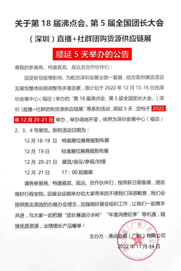 因受新冠疫情影響、為配合深圳會(huì)展業(yè)統(tǒng)一復(fù)展,結(jié)合政府展覽項(xiàng)目及展館整體排期調(diào)整等多重因素,原計(jì)劃于2022年12月15-16日在深圳會(huì)展中心(福田)舉辦的“第18屆沸點(diǎn)會(huì)、第5屆全國(guó)團(tuán)長(zhǎng)大會(huì)、(深圳)直播+社群團(tuán)購(gòu)貨源供應(yīng)鏈展”等系列活動(dòng),順延5天,定檔于 2022年12月20-21日 舉辦,舉辦場(chǎng)地不變,依然為深圳會(huì)展中心(福田)2、3、4號(hào)展館。新的活動(dòng)日期為: