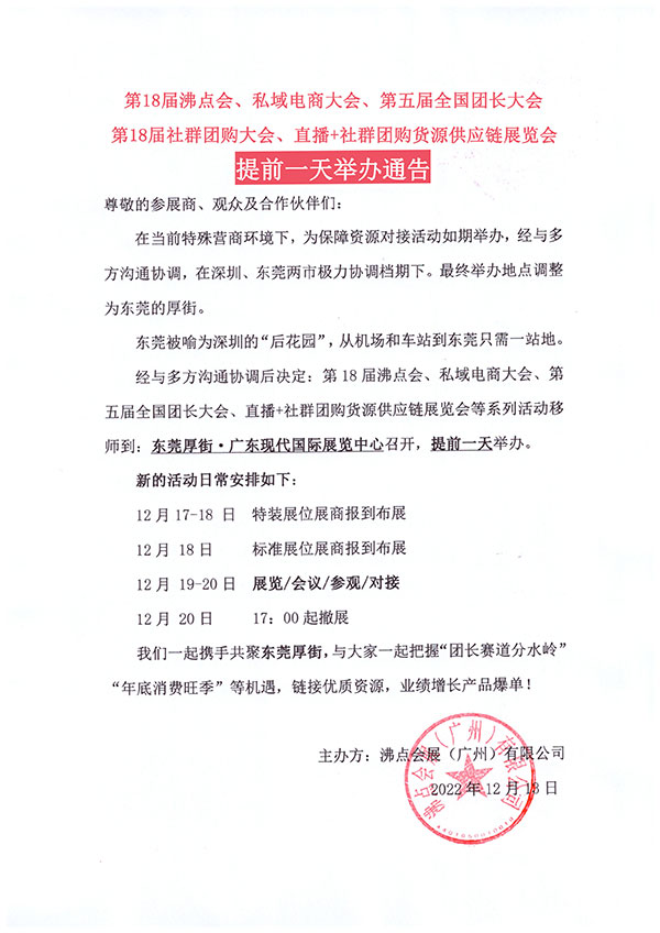經與多方溝通協調后決定:第18屆沸點會、私域電商大會、第五屆全國團長大會、直播+社群團購貨源供應鏈展覽會等系列活動移師到:東莞厚街·廣東現代國際展覽中心召開,提前一天舉辦。