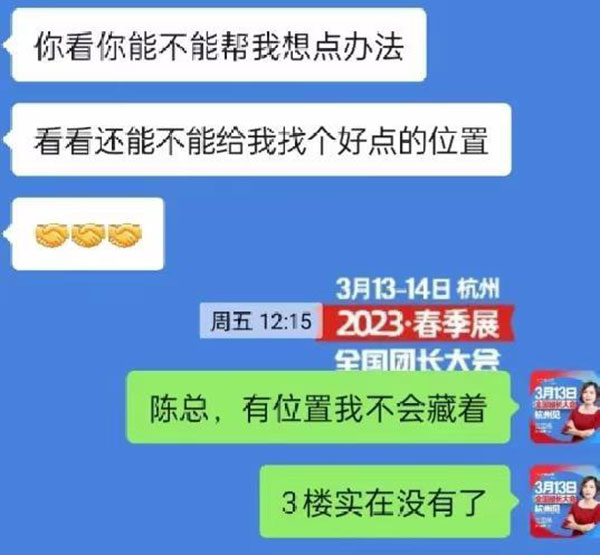 看到我們展位要賣完了,就問:能不能想辦法幫我找個好點的展位?