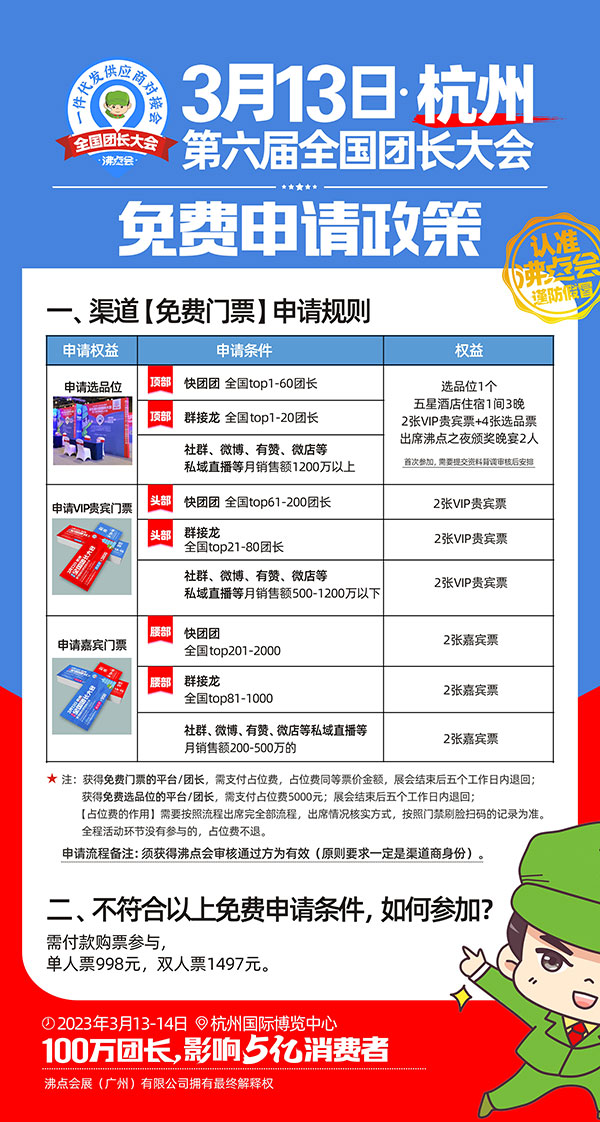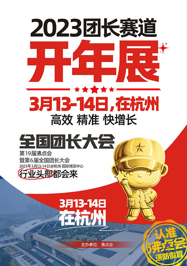 2023年沸點會排期:全國團長大會(第六屆)3月13-14日在杭州國際博覽中心,全國團長大會(第七屆)8月8-9日在廣州保利世貿博覽館舉辦,敬請關注。