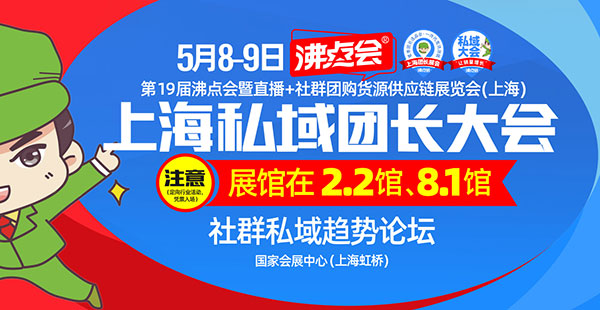 上海團長大會由中國服務貿易協會社交電商分會作為指導單位,豫園文化飲食作為協辦單位,沸點會展(廣州)有限公司作為大會主辦單位的“第19屆沸點會暨直播+社群團購貨源供應鏈展會(上海)、第6屆全國團長大會、私域電商大會、上海團長大會”等系列展覽及會議論壇活動定于2023年5月8日-9日在國家會展中心(上海)舉辦。