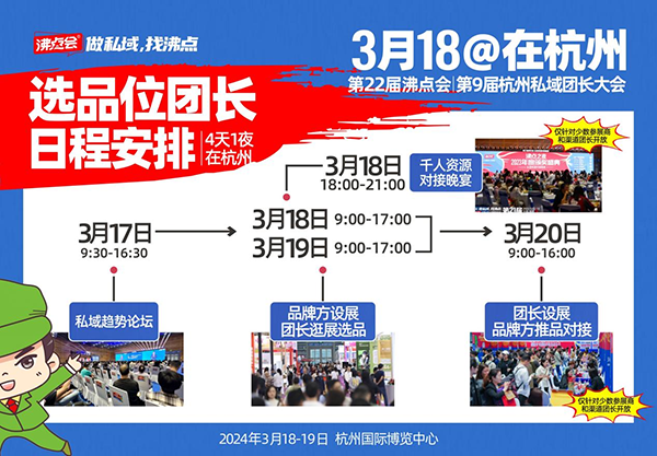 由社群團長私域生態鏈建設機構、全國團長大會創辦機構——沸點會主辦的,第22屆沸點會暨2024春季全國團長選品會將在2024年3月18-19日在杭州國際博覽中心舉辦。
