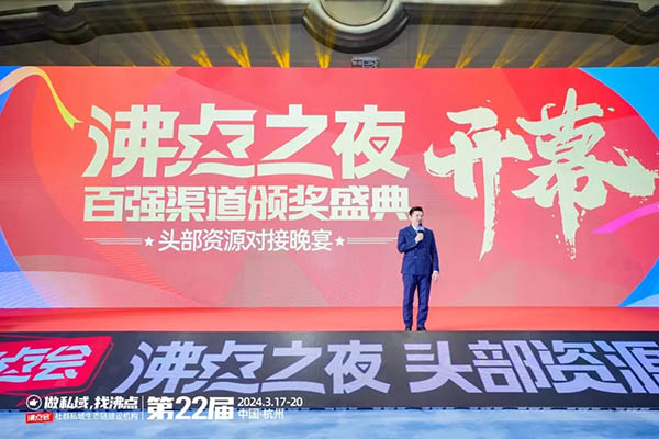 第22屆沸點會暨2024私域團長大會于3月18-19日在杭州國際博覽中心舉辦,3月18日晚上舉辦了沸點之夜資源對接晚宴暨百強渠道頒獎晚宴,私域頭部供貨商和私域頭部團長都參加了這次活動。