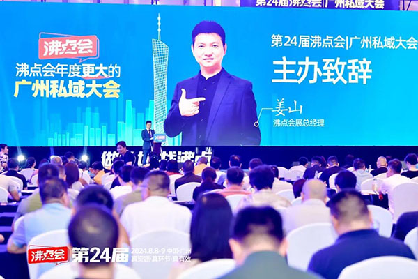 沸點會展總經理/姜山致開場致辭。姜總表示,在立秋這個特殊的節氣,迎來了沸點會的第24屆盛會,深感榮幸。并強調,自2015年踏入私域渠道以來,十年的風雨兼程離不開大家的支持與見證。如今,沸點會規模不斷擴大,本屆更是六大展館全開,兩大論壇同步研討。私域市場已成為重要銷售渠道之一,為更好地激發市場活力,今年特別規劃了一年四展的布局,旨在滿足不同季節的渠道選品需求,推動服務消費高質量發展,為合作伙伴提供更精準、優質的資源,攜手開啟新篇章。