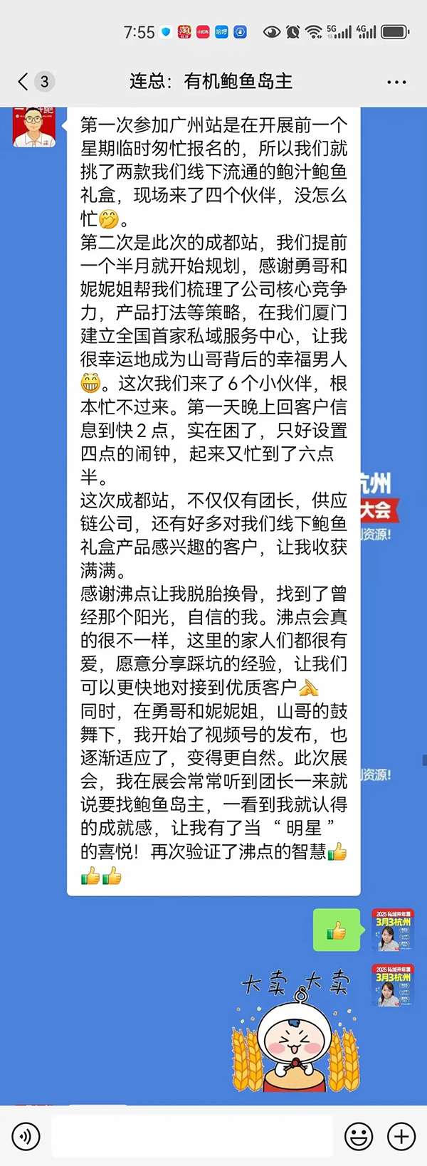 有機鮑魚一貫好鮑反饋:參加沸點私域團長大會,不僅可以對接頭部私域團長,還可以獲得友商幫助,私域圈子像家人