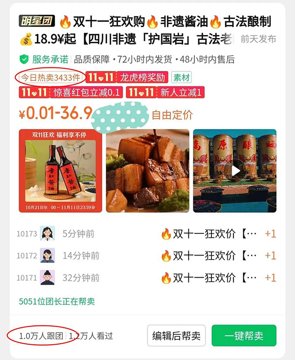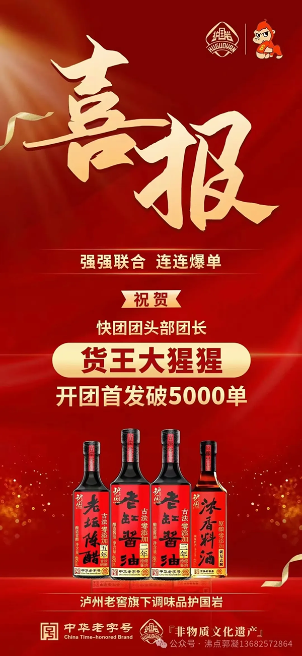 現在回溯至10月的成都私域展會,護國巖初次借助沸點會踏入私域領域,首秀即保單。其中,“護國巖” 護國陳醋和貨王大猩猩強強聯手,于11月8號開團老缸醬油首發破5000單,截止11月11號已增長爆單至10173單!