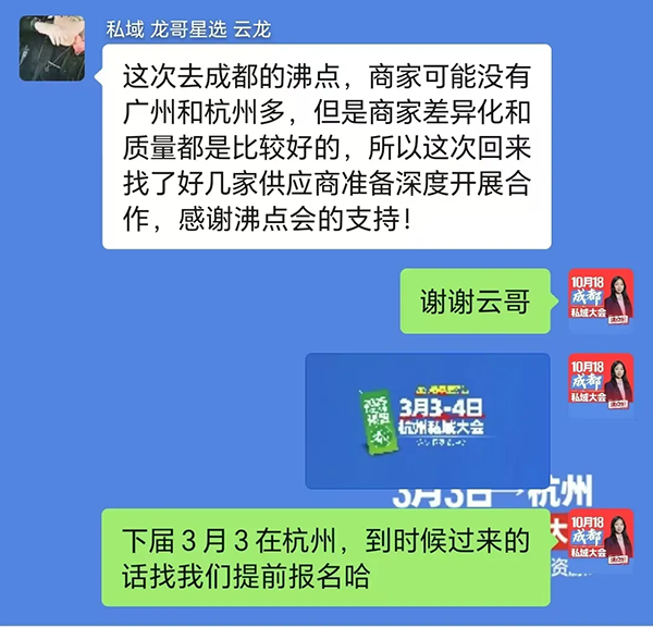 私域 龍哥星選 云龍:這次去成都的沸點,商家可能沒有廣州和杭州多,但是商家差異化和質量都是比較好的,所以這次回來找了好幾家供應商準備深度開展合作,感謝沸點會的支持!