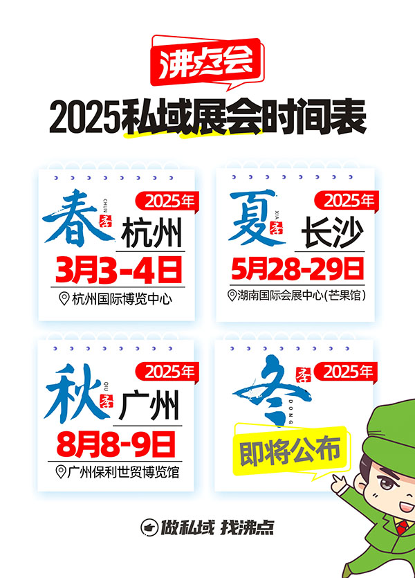 下一屆沸點私域直播大會,定在2025年3月2-4日,于杭州國際博覽中心舉辦。如果你想對接私域頭部渠道,趕緊報名參加吧!