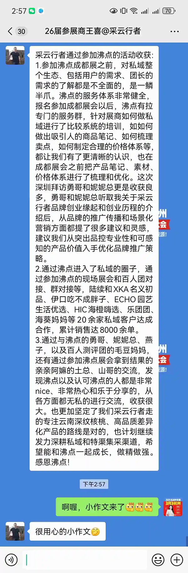 1.在認(rèn)知層面實(shí)現(xiàn)了質(zhì)的飛躍。起初,在參加沸點(diǎn)成都展之前,采云行者對私域生態(tài)的認(rèn)知比較有限。但沸點(diǎn)會健全的服務(wù)體系迅速發(fā)揮作用,報名展會后,專門的服務(wù)群及時建立,系統(tǒng)培訓(xùn)接踵而至。在培訓(xùn)中,學(xué)習(xí)到制作吸引人的商品筆記、梳理產(chǎn)品賣點(diǎn)以及制定合理價格體系等重要技能,這使得采云行者在展會前得以全面梳理優(yōu)化產(chǎn)品筆記、素材與價格體系,為后續(xù)發(fā)展奠定基礎(chǔ)。之后深圳拜訪勇哥和妮妮總時,他們在了解采云行者的創(chuàng)業(yè)緣起與歷程后,于品牌推廣傳播和場景化營銷方面提供了諸多寶貴建議與靈感,著重指出應(yīng)突出品控專業(yè)性和可感知的產(chǎn)品價值來優(yōu)化策略。