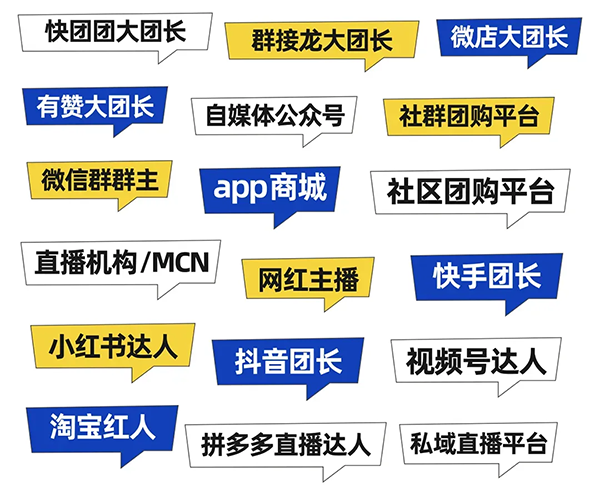 社群團購平臺、社區團購平臺、社交電商平臺、微信團購群群主、快團團大團長、群接龍大團長、有贊分銷店主、微店分銷店主、自媒體公眾號、微博分銷、小紅書博主、私域團購電商、私域直播、抖音主播、快手主播、視頻號主播、MCN機構等。