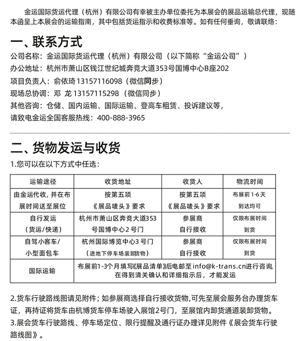 本次展覽的主場物料運輸工作,由金運物流負責。如果您有展品需要快遞,建議優先選擇主場金運物流服務。為了保障展品順利運輸,還請您提前與金運物流取得聯系,溝通確認好快遞時間、接收時間以及費用等相關事項 。
