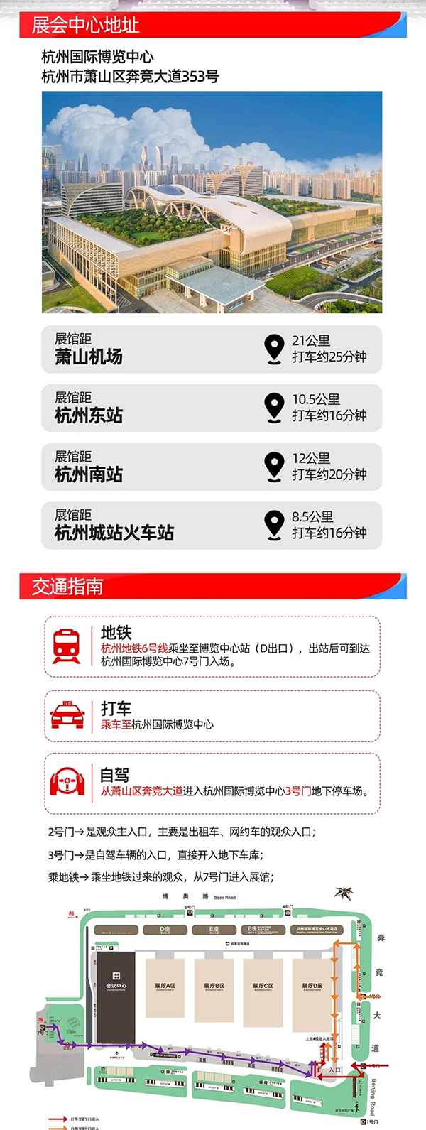 為了助力您暢行無阻,我們精心梳理了從杭州各交通樞紐出發前往展館的最優出行攻略,各類交通方式一應俱全。建議您提前查閱交通指南,確保一路順遂,準時抵達展館,開啟精彩之旅。