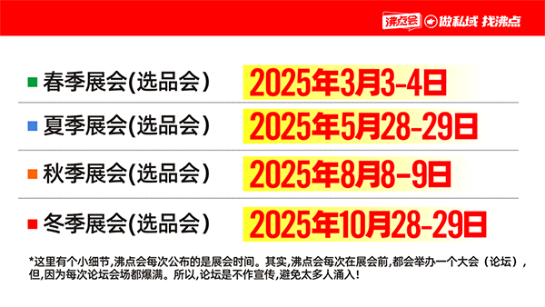 沸點會通過“時間-區域-主題”的三維布局,構建了一張覆蓋全國、貫穿全年的私域資源網絡。對參展商而言,關鍵在于厘清自身需求——是發布新品、拓展區域,還是對接垂直渠道?答案背后,正是沸點會四場展會提供的差異化價值。選擇與戰略匹配的戰場,方能最大化參展效益,在私域競爭中搶占先機。