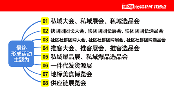 1. 渠道類:私域大會、快團團團長展、社區社群團購展、推客展。