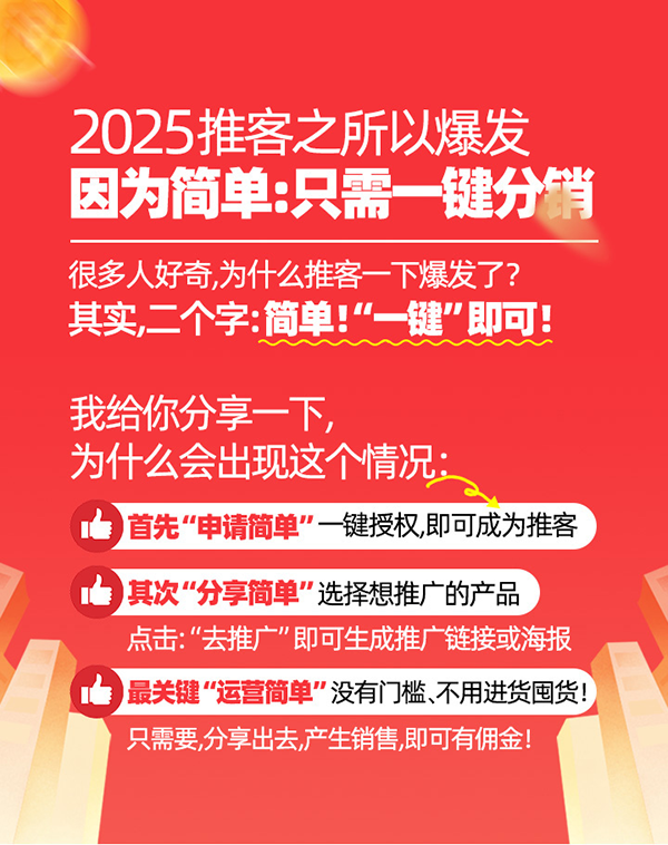 2025年突如其來的"推客私域"正在改寫電商格局,而2025年這場全民分銷革命迎來全面爆發。究竟是什么讓這個模式突破圈層壁壘?答案就藏在兩個關鍵詞里——極簡操作。
