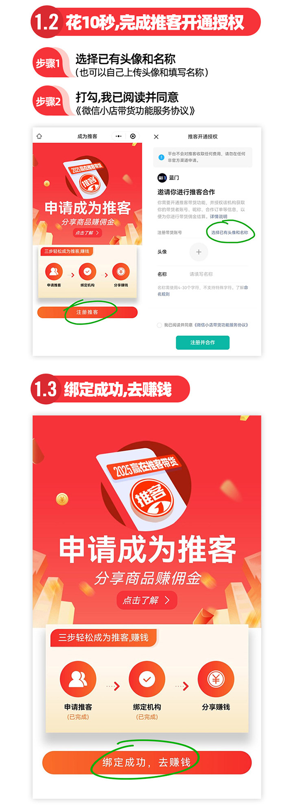 傳統分銷需要繁瑣的資料審核,而推客模式將身份認證壓縮到三步:選擇頭像昵稱→勾選協議→點擊授權,整個過程比發條朋友圈還簡單。這種"無感注冊"徹底消除了用戶的心理門檻,讓每個人都能在刷手機的間隙完成商業身份轉變。