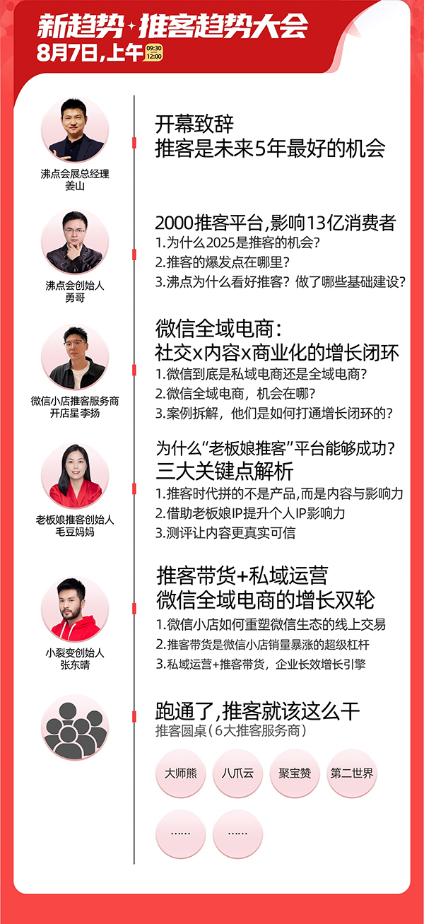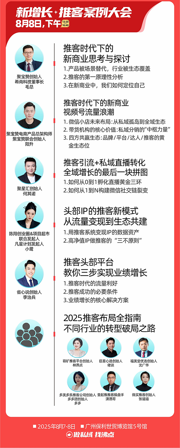 由沸點會舉辦的2025廣州萬人推客大會定于8月7-9日在廣州保利世貿博覽館舉辦!活動由6個館組成!二天論壇+二天展會!解決大家關注推客的怎么干的經驗方法問題,以及資源對接問題!