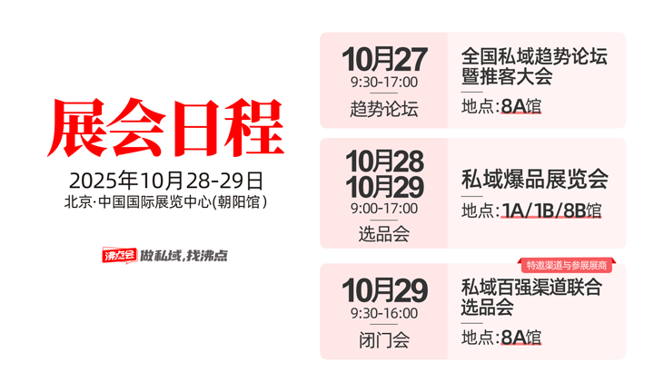 新聞導讀2025 年 10 月 28-29 日,沸點會將在北京?中國國際展覽中心(朝陽館)舉辦北京私域展會,核心開設【年貨展區】打造專屬年貨選品會,破解年底私域渠道 “忙促銷難選品”、供貨商 “找渠道難對接” 的痛點,助力供貨商精準鏈接 98% 私域頭部渠道,搶占雙 11 至春節的消費紅利。年底選年貨,就來沸點會;做私域,找沸點!