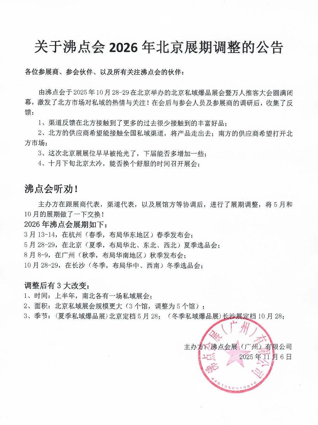 新聞導讀由沸點會于2025年10月28-29舉辦的北京私域展會圓滿閉幕,激發了北方市場對私域的熱情與關注!在會后與參會人員及參展商的調研后,進行了展期調整,將5月和10月的展期做了一下交換!