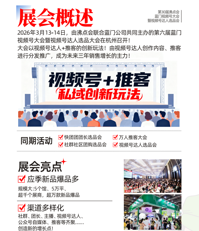 杭州視頻號爆品展暨杭州視頻號選品大會是每年3月13沸點會在杭州舉辦的私域開年展的一部分,跟藍門視頻號大會共同主辦。主要幫助視頻號達人對接貨源,幫助視頻號達人選品。同時,也是推客視頻號達人與推客進行對接的橋梁,創建了一個新的模式玩法!
