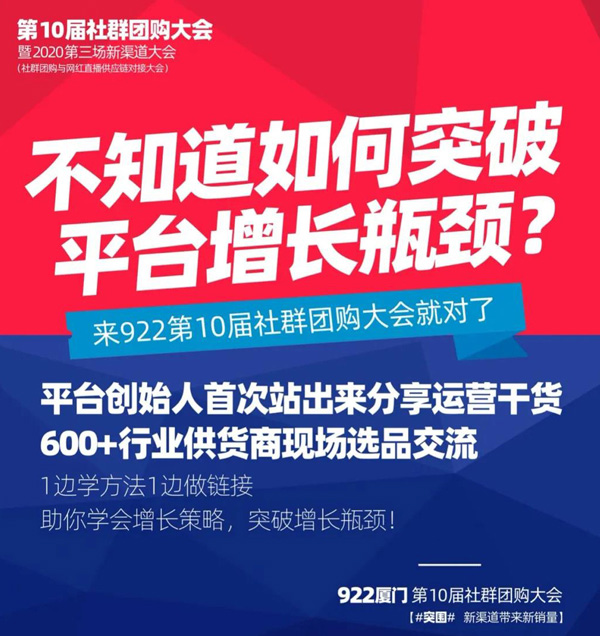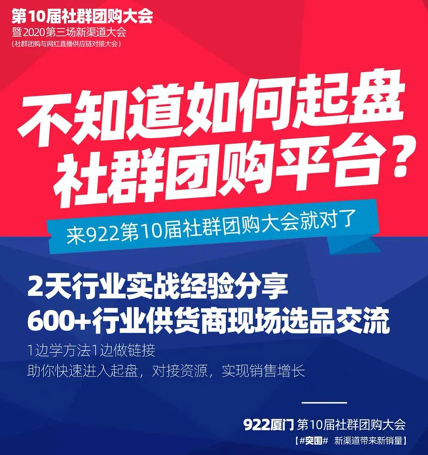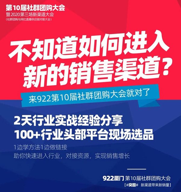 922廈門第10屆社群團購大會,在金秋9月這個豐收的季節,也是這個對下半年有著極大影響力的一個重要的月份。希望所有人,都能把握機會,突圍,新渠道帶來新銷量。