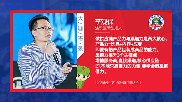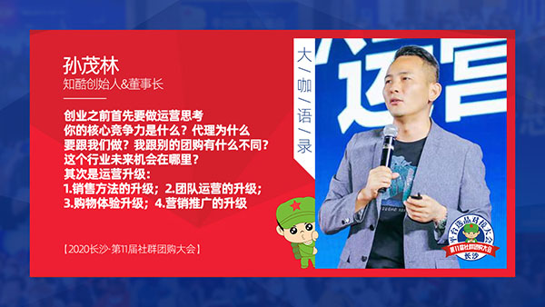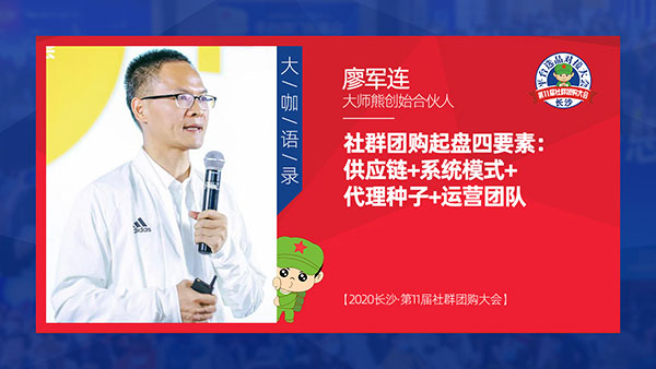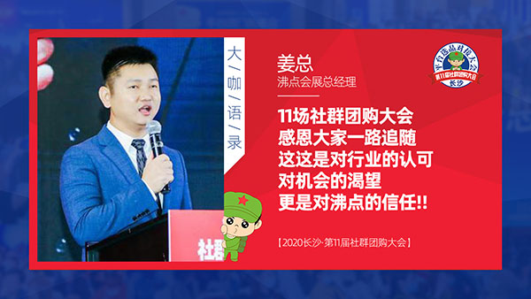 2020年10月21日第11屆社群團購大會暨第四屆新渠道大會在長沙舉行,本次大會由沸點天下主辦,沸點會展與4458貨源網承辦,由江畔大學,江畔校友會協辦;系統戰略合作伙伴大師熊與直播版塊合作伙伴知酷支持。