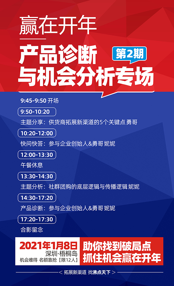 針對2021開年展客戶,我們有一個【贏在開年診斷會】,帶著你的產品來,我們給你渠道拓展的建議,聽了你就知道怎么做了。