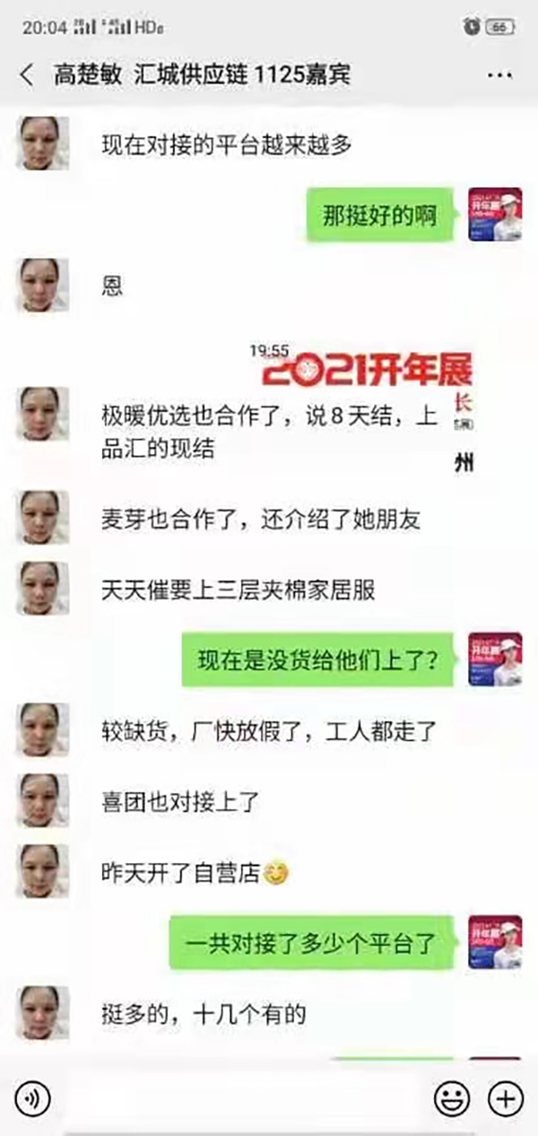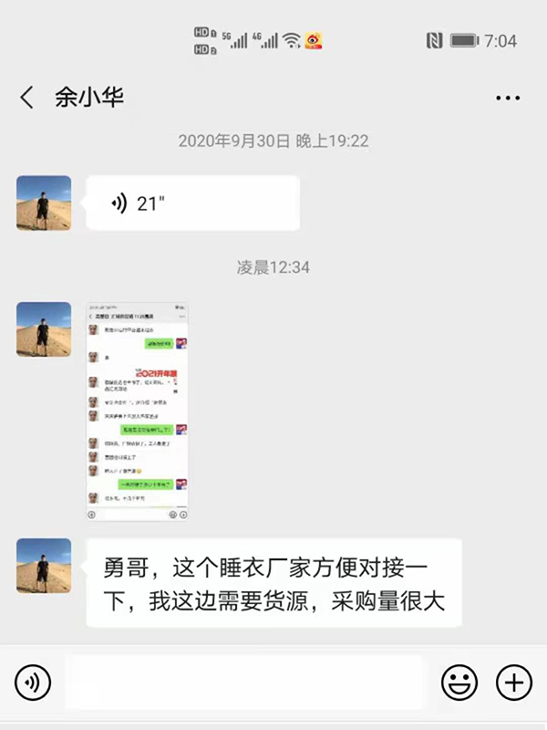 昨天晚上客戶發(fā)完反饋后,同事發(fā)到群里,勇哥也轉(zhuǎn)發(fā)了朋友圈,晚上就有客戶跟勇哥私信:我想對(duì)接這個(gè)睡衣供應(yīng)鏈,量挺大的。