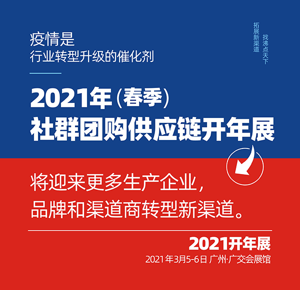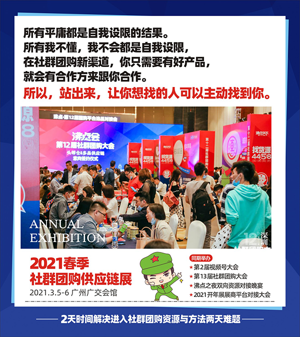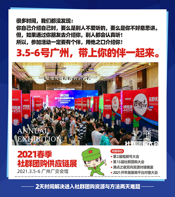 總之,2021年3月5-6號,沸點天下在廣州廣交會館舉辦的2021春季社群團購選品會,無論是內容,規(guī)模,影響力,還是展商質量等,將是行業(yè)影響力第一的展會,對想要在2021年實現(xiàn)開門紅的朋友們來說,來2021春季社群團購選品會一定要參加。