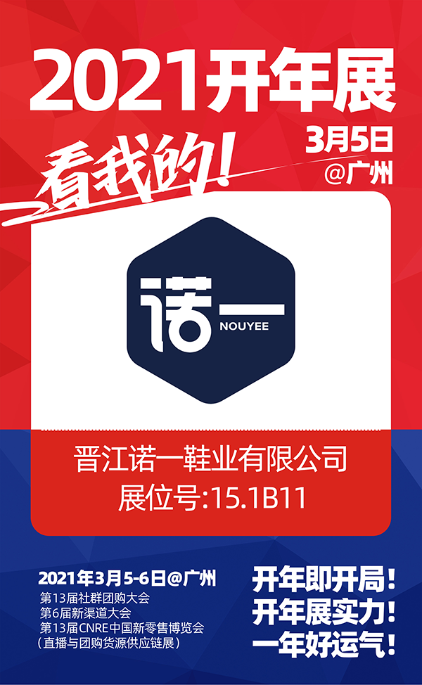 2021年3月5日-6日,2021社群團購供應鏈開年展,晉江諾一鞋業與你相約廣州廣交會館,不見不散,展位號:15.1B11