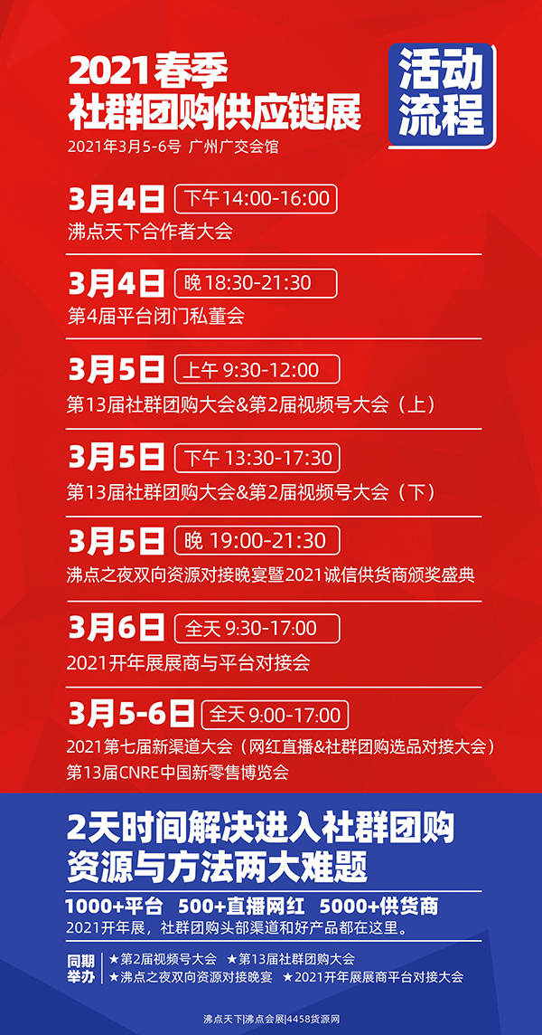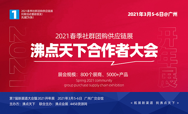 2021年,為更好的服務(wù)行業(yè),社群團(tuán)購(gòu)供應(yīng)鏈展主辦方沸點(diǎn)天下策劃了一系列同期活動(dòng),涵蓋合作者大會(huì)+私董會(huì)+大會(huì)+晚宴+頒獎(jiǎng)+平臺(tái)精準(zhǔn)選品對(duì)接+供應(yīng)鏈展會(huì)+春季新品發(fā)布等7大主題活動(dòng),2021春季社群團(tuán)購(gòu)供應(yīng)鏈展將融合行業(yè)上中下游資源,打造更為精準(zhǔn)的行業(yè)品牌推廣合作平臺(tái),在3月5-6號(hào),廣州廣交會(huì)館為行業(yè)社群團(tuán)購(gòu)創(chuàng)業(yè)者奉獻(xiàn)一場(chǎng)精彩絕倫的饕餮盛宴。