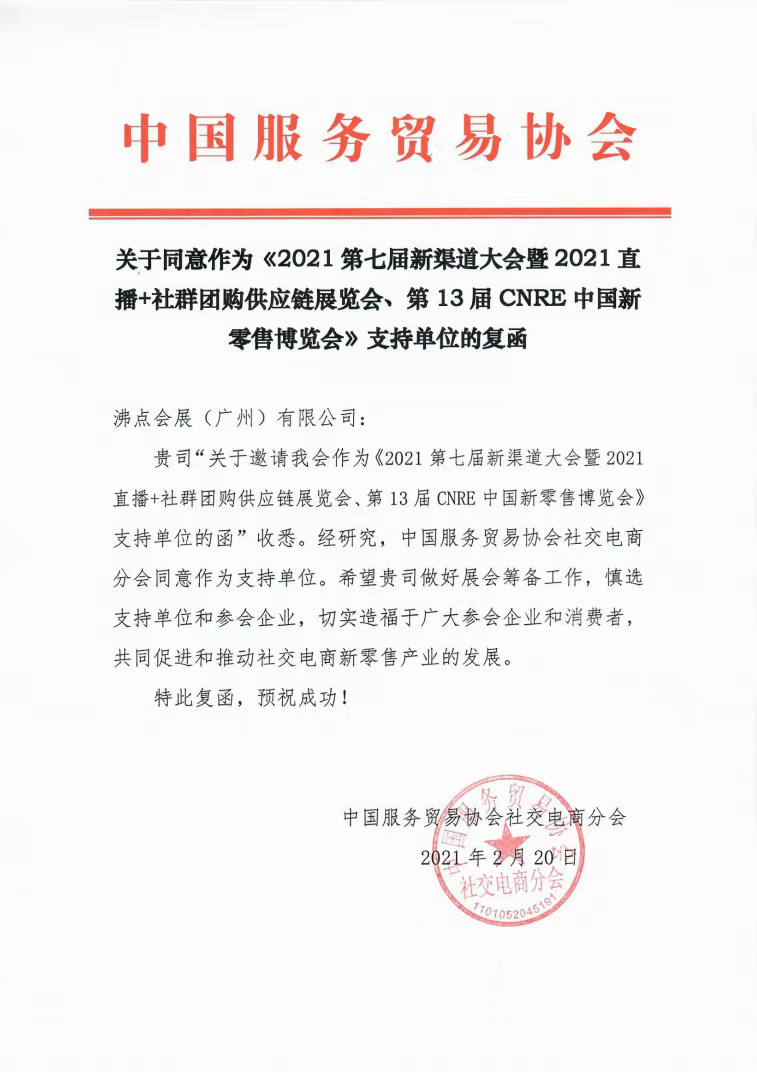 中國服務貿易協會社交電商分會支持由沸點天下舉辦,沸點會展和4458貨源網聯合承辦的2021新渠道大會暨2021直播+社群團購供應鏈展覽會。