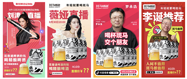 在直播混戰的一年中,斑馬精釀憑借優秀口感和嚴格的品控,征服 了一眾頭部主播們挑剔的選品團隊。僅在2020一年間,就獲得劉 濤、薇婭、羅永浩、李誕、吉杰、沈濤、張藍心等一眾明星大咖傾力 推薦,屢破同品類實時銷售記錄。