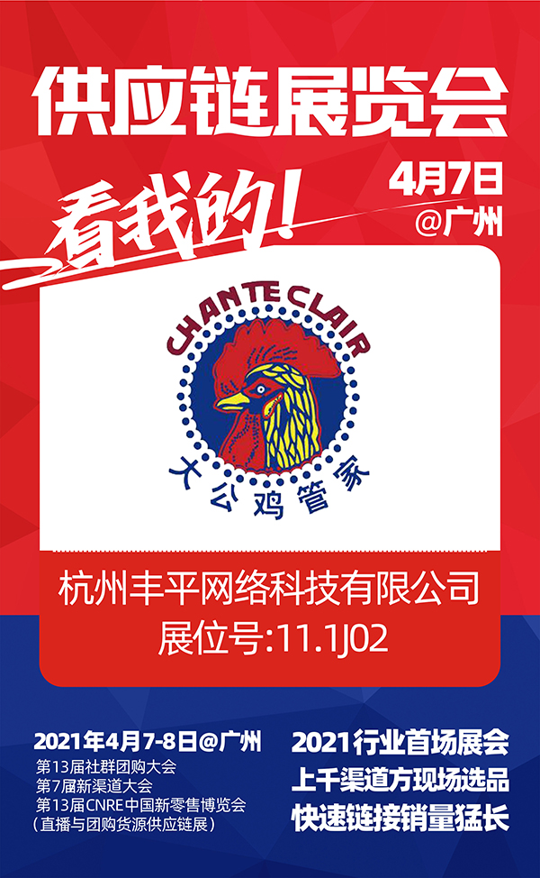由沸點天下、沸點會展、4458貨源網(wǎng)聯(lián)合舉辦的“2021第七屆新渠道大會(社群與直播供應(yīng)鏈展)、第13屆CNRE新零售博覽會”將于2021年4月7-8日在廣州廣交會館B館舉辦。杭州豐平網(wǎng)絡(luò)科技有限公司受邀參展2021供應(yīng)鏈展覽會!