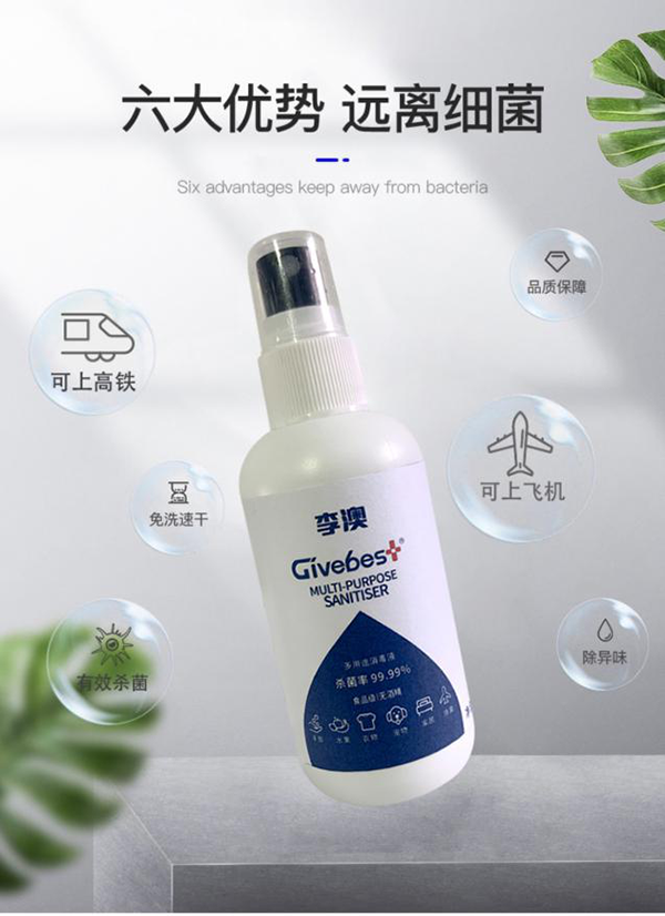 4、產品用料安全、高效、環保,對人體無任何刺激性,屬于食品級材料,不慎入口入眼均安全。能有效殺滅細菌和病毒達99.99%,用后會分解為水,天然無害,產品不含酒精、香料及防腐劑,嬰幼兒及寵物也可安全使用。可用于車內、辦公室及嬰兒房等室內甲醛去除,廁所、電梯等室內異味去除。產品已取得美國FDA、歐盟TUV、CE等認證,更在香港STC及國際SGS檢測所取得空氣滅菌達99.99%的優良成績單。