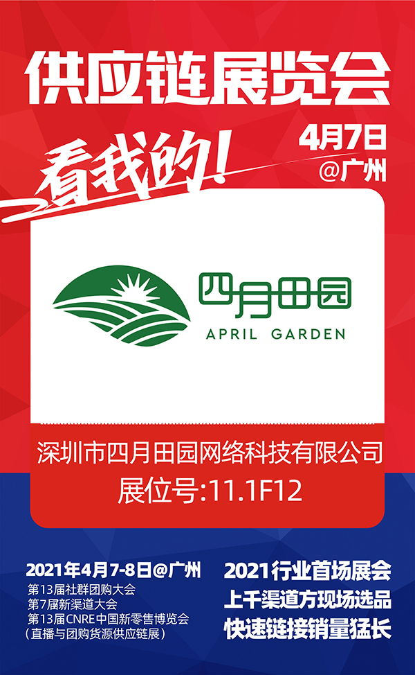4月7-8號,2021社群團購供應鏈開年展,深圳市四月田園網絡科技有限公司與你相約廣州廣交會館,不見不散!
