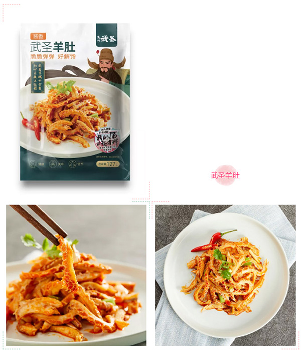 選自每只羊只此一塊的金錢肚,拒絕火堿泡發等不健康處理方式,經過清洗,白醋浸泡等一系列的方式,保留羊肚鮮香的本味,脆嫩彈牙的口感。食用簡單方便:開袋切絲,淋入料汁即可享用。