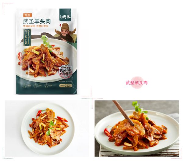 武圣精選貼骨羊頭肉,經過清洗、除雜、去腥、慢鹵等工藝使其口味醇厚,口感軟糯順滑,羊頭肉具有豐盈的膠原蛋白,美味美膚兩全。開袋后切成喜歡的大小,淋上香醋與辣椒油,簡單的攪拌即可縱享美味。