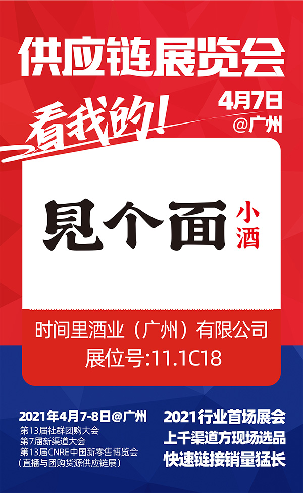 由沸點天下、沸點會展、4458貨源網聯合舉辦的“2021第七屆新渠道大會(社群與直播供應鏈展)、第13屆CNRE新零售博覽會”,參展商和平臺方都在踴躍報名中,時間里酒業(廣州)有限公司(以下簡稱“見個面小酒”)受邀參展2021社群團購供應鏈開年展!