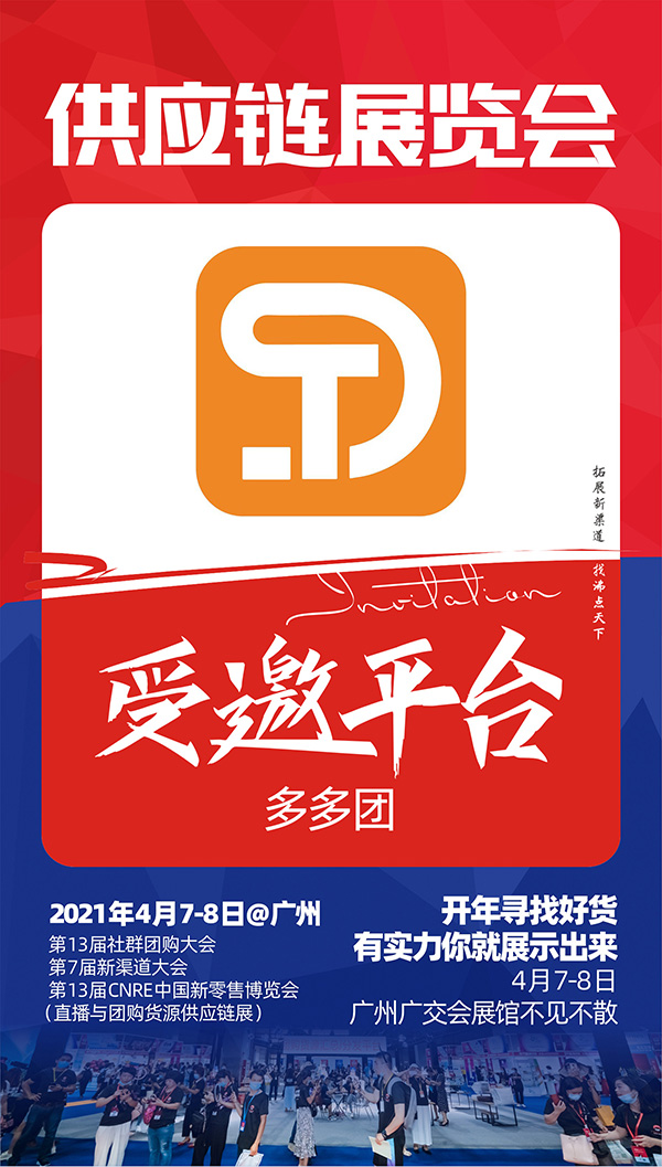 2021供應鏈展覽會組織更多的優秀的新渠道商、平臺方、貨源方、供應鏈、品牌方以及服務商匯聚廣州,進行精準資源對接與合作,通過沸點特色的辦展辦會模式不斷創新和升級,為行業發展注入新的動力,多多團誠邀供貨商朋友帶著產品來展位洽談合作。