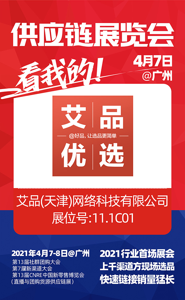 2021年4月7-8號,2021社群團購供應鏈開年展,艾品(天津)網絡科技有限公司與你相約廣州廣交會館,展位號:11.1C01,不見不散。