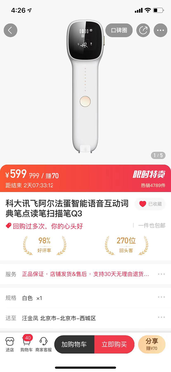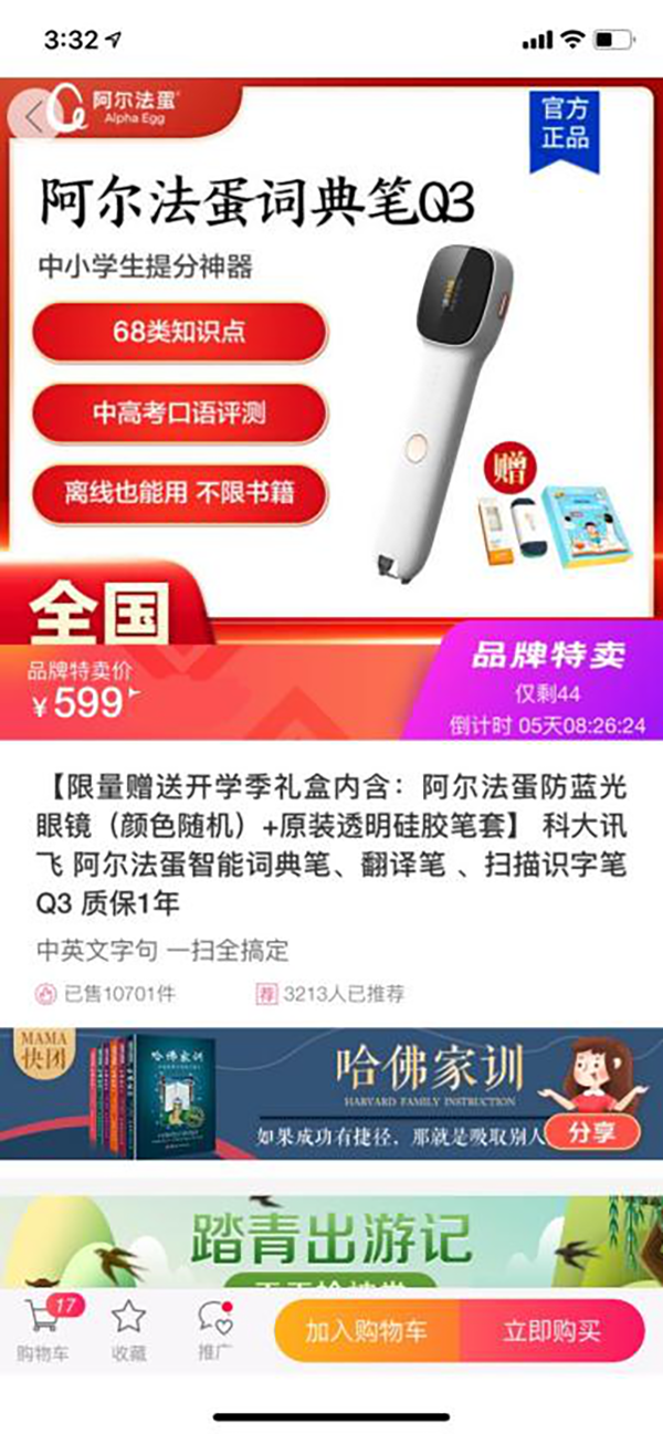 艾品(天津)網絡科技有限公司主打訊飛阿爾法蛋詞典筆Q3,在大V店、洋蔥、云集、凱叔、盧司玲、斑馬易團、猩球掌柜等平臺,及其它渠道共計銷售8萬多支。