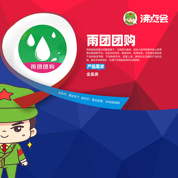 雨團(tuán)團(tuán)購入駐平臺(tái)展位,歡迎供應(yīng)商朋友們帶樣品洽談合作。同時(shí)本屆大會(huì)主要分為春季爆品展區(qū)、零食食品區(qū)、服裝鞋包區(qū)、家居百貨區(qū)、孕嬰童產(chǎn)品區(qū)、小家電展區(qū)、跨境商品展區(qū)六大展區(qū),設(shè)置1000個(gè)展位,預(yù)計(jì)有5000款產(chǎn)品現(xiàn)場(chǎng)展示對(duì)接。