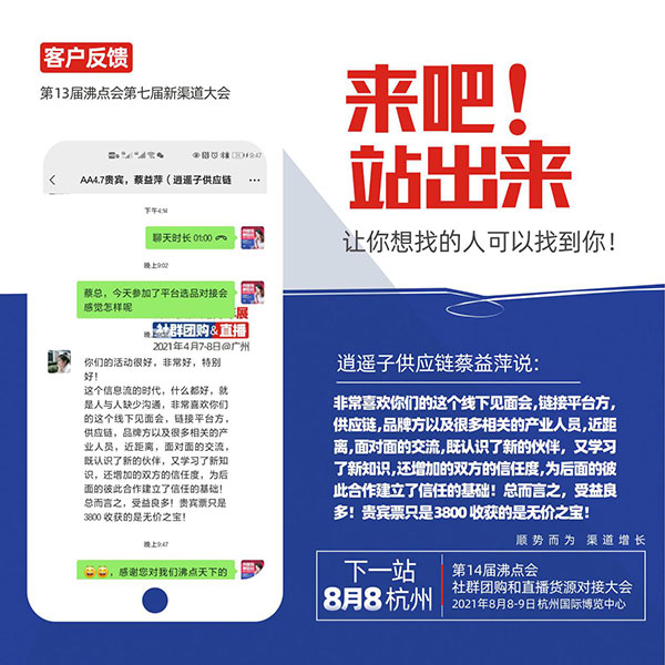 剛剛結束的第13屆沸點會暨平臺選品對接會,好評如潮,本次大會由沸點天下舉辦,吸引了來自全國的600多家供應鏈,和來自社群團購,社區團購,直播個人,直播機構,微信群,自媒體,平臺等多個渠道的眾多采購方前來找品合作,會后獲得參會者一致好評,逍遙子供應鏈受邀參加活動。